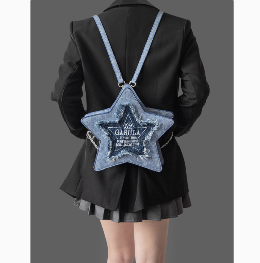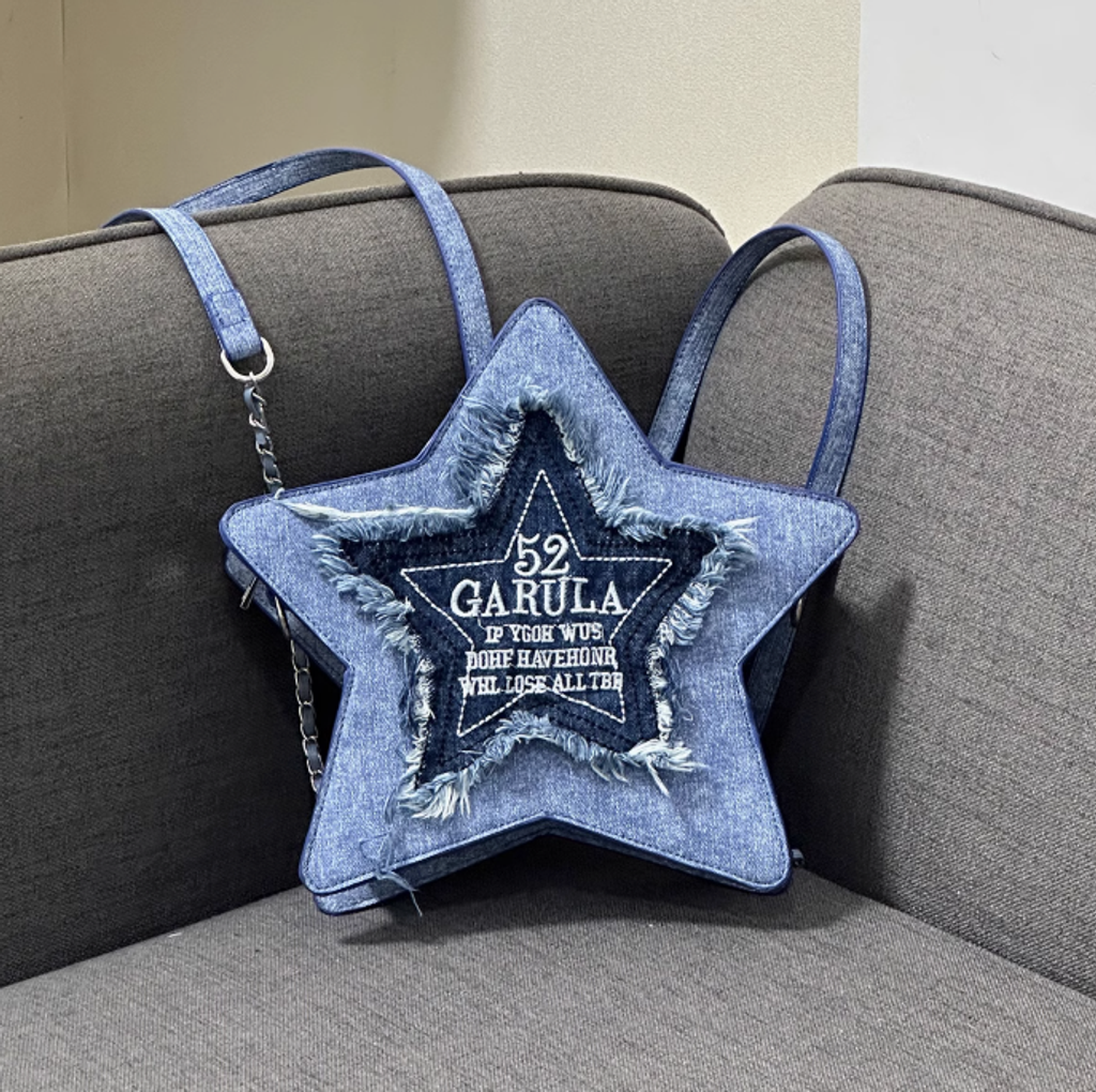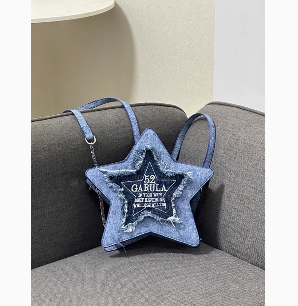 HIATUS原創設計牛仔藍五角星雙肩包刺繡字母流蘇Y2K斜挎包
