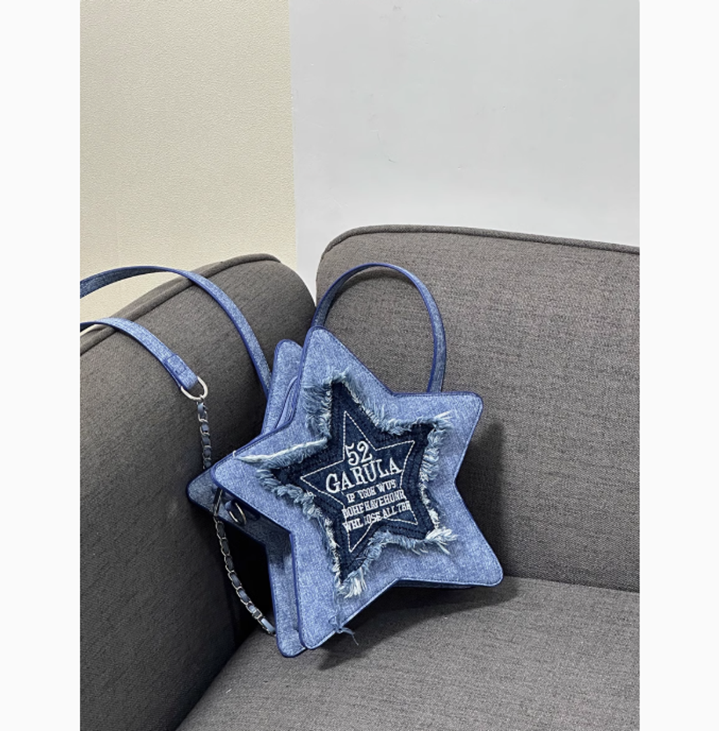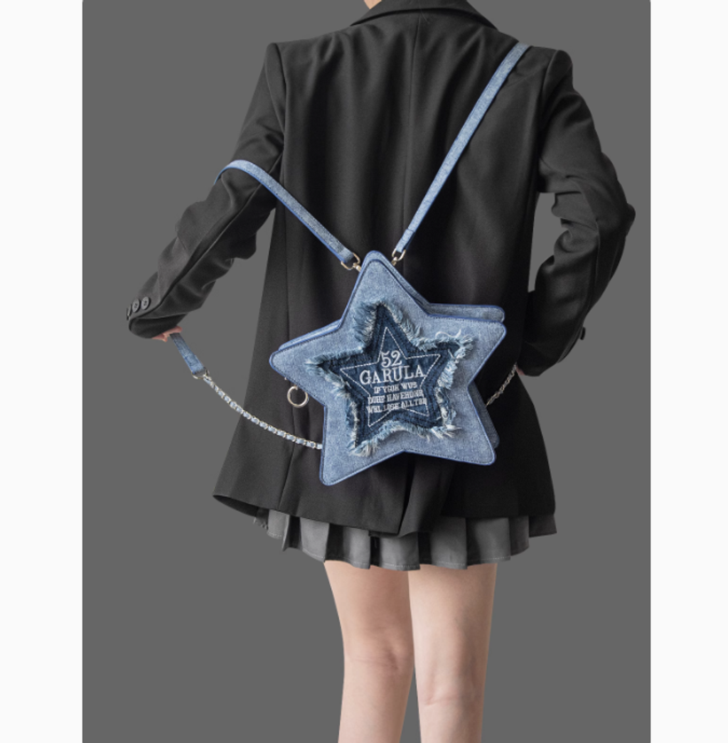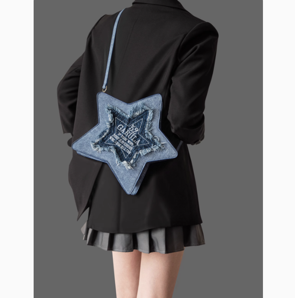 HIATUS原創設計牛仔藍五角星雙肩包刺繡字母流蘇Y2K斜挎包