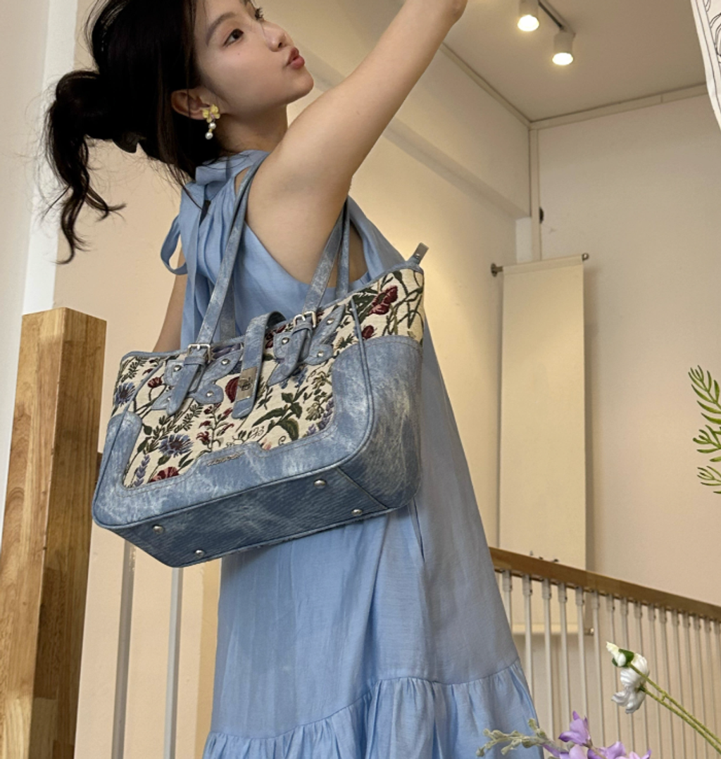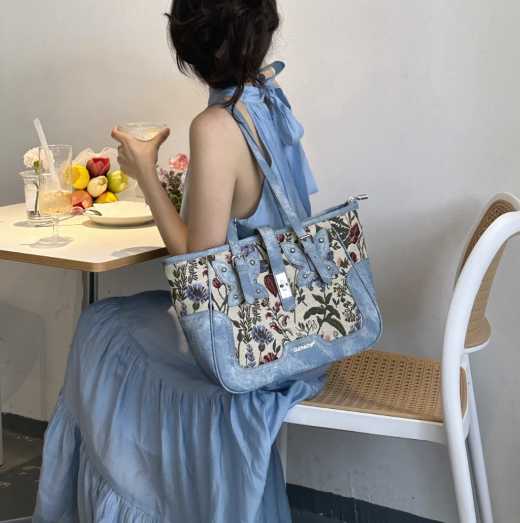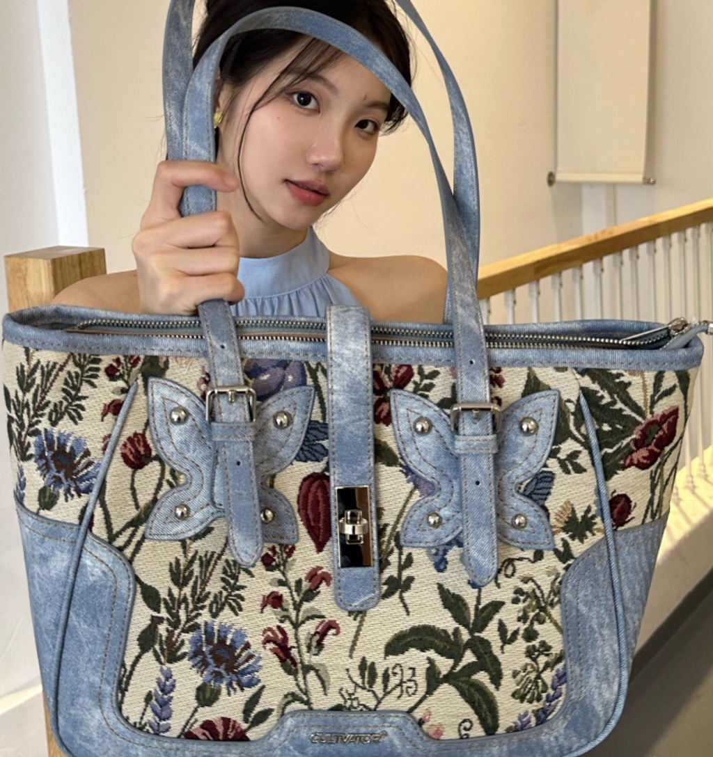 Cultivator原創小眾復古時尚牛仔蝴蝶花卉拼接通勤手提單肩托特包