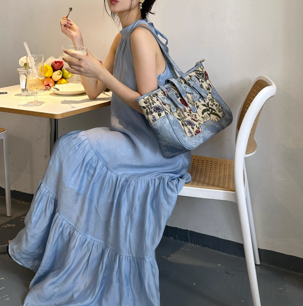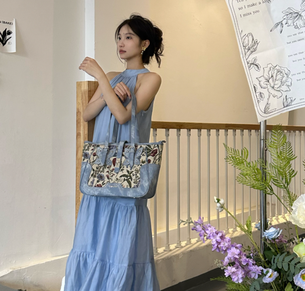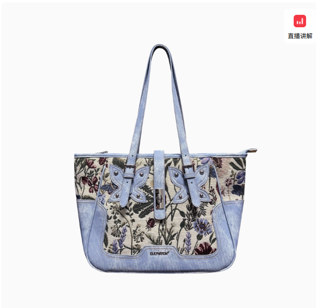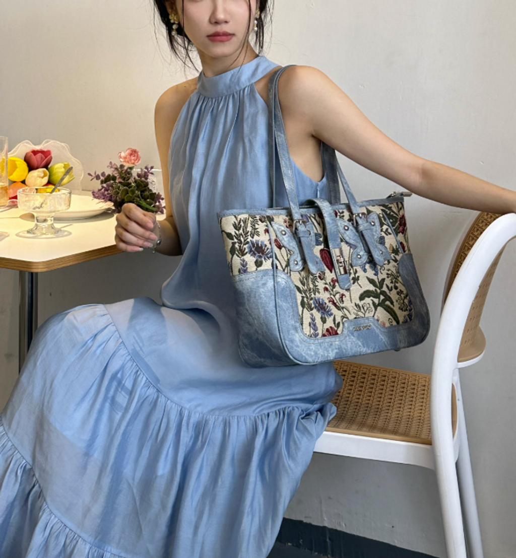 Cultivator原創小眾復古時尚牛仔蝴蝶花卉拼接通勤手提單肩托特包